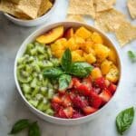 A vibrant and refreshing fruit salsa made with peaches, mango, kiwis, strawberries, and a hint of fresh basil, served alongside crunchy cinnamon sugar tortilla chips baked to perfection. This recipe is perfect for a light snack or a healthy dessert with a delightful combination of sweet and tangy flavors.