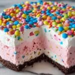 This fun and colorful Funfetti Ice Cream Cake combines a crunchy chocolate cookie crust with creamy strawberry ice cream mixed with whipped cream and rainbow sprinkles. Topped with a cloud of whipped cream and more sprinkles and candy, it’s a perfect no-bake dessert that’s festive, easy to make, and sure to delight for any celebration or summer treat.