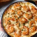 You can freeze the Garlic Shrimp Gratin Recipe before baking by covering the assembled dish tightly with foil and plastic wrap. Freeze for up to 1 month. Thaw overnight in the fridge before baking as directed.