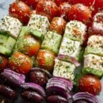 Store leftover skewers in an airtight container in the refrigerator for up to 2 days. Keep the dressing separate to prevent sogginess if you plan to enjoy them later. When you’re ready to eat, toss with fresh dressing for that just-made taste sensation.
