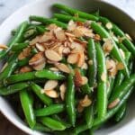 A quick and delicious Green Beans Almondine recipe featuring tender green beans sautéed with toasted slivered almonds and garlic, finished with a hint of lemon juice and Parmesan cheese for a perfect balance of flavors and textures.