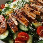 - Add the chicken and cheese: Top the dressed salad with the sliced grilled chicken and sprinkle with crumbled feta or goat cheese if desired for extra creaminess and flavor.