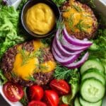 These Grilled Juicy Burger Bowls combine perfectly seasoned and grilled beef patties with fresh, vibrant greens and a tangy homemade dressing, all served in a bowl for a delicious and healthy twist on the classic burger.