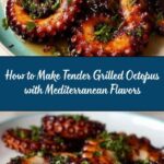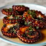 This grilled octopus recipe delivers tender, flavorful seafood with a smoky char from the grill. The octopus is first simmered with aromatics to ensure tenderness, then marinated in a zesty blend of olive oil, red wine vinegar, and smoked paprika before being grilled to perfection. Finished with fresh parsley and lemon wedges, it’s a classic Mediterranean dish that’s perfect as a main course for seafood lovers.