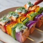 Delicious grilled salmon skewers marinated with garlic, lemon, and smoked paprika, served with a creamy dill Greek yogurt sauce. This Mediterranean-inspired main course is healthy, high in protein, and perfect for summer grilling.