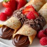 Delight in these delicate handmade chocolate-filled rolled crêpes, perfect for a quick and delicious breakfast or dessert. Thin, tender crêpes are cooked to golden perfection and filled with a rich chocolate hazelnut spread, then rolled and optionally dusted with powdered sugar for an elegant touch.