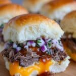 Pull the beef apart with forks and start building your sliders by layering pepper jack slices, a generous heap of shredded beef, a drizzle of your favorite barbecue sauce, and a sprinkle of shredded cheddar. Top with the buttery toasted roll lids.