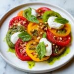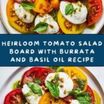 A vibrant and fresh Heirloom Tomato Salad Board featuring assorted heirloom tomatoes, creamy burrata cheese, and fragrant basil oil. This easy-to-assemble dish is perfect as an elegant appetizer or light meal, showcasing a colorful blend of flavors and textures enhanced with toasted pine nuts and served with crusty bread or crostini.