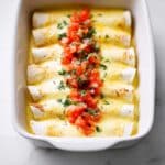 Absolutely! Substitute the shredded chicken with cooked black beans or sautéed vegetables like bell peppers and zucchini. Adjust the spice levels to your taste and you’ll have a delicious vegetarian version of these enchiladas.