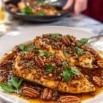 Once the chicken is cooked, drizzle honey generously over each breast in the skillet. Sprinkle the toasted pecans on top and cover again to allow the sauce to thicken and the flavors to meld for a couple of minutes. The honey will soften while the pecans release their nutty oils, creating a dreamy, glossy topping that perfectly coats the chicken.