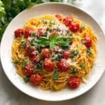 - Create the Tomato Marinade: In a large bowl, combine halved cherry tomatoes, olive oil, minced garlic, julienned basil leaves, red pepper flakes, salt, and freshly ground black pepper. Toss gently to mix everything well. Cover the bowl with plastic wrap and let the mixture marinate at room temperature for at least 30 minutes and up to 4 hours to allow the flavors to meld.