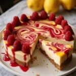 This Lemon Raspberry Cheesecake is a luscious and creamy dessert featuring a buttery graham cracker crust, a tangy lemon-infused cream cheese filling, and fresh raspberries for a burst of natural sweetness. Perfectly balanced with a hint of vanilla and topped with juicy raspberries, this cheesecake is ideal for any occasion.