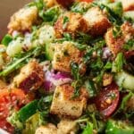 This Loaded Fattoush Salad combines fresh, crisp vegetables with tangy sumac, zesty pomegranate molasses dressing, and crunchy sautéed pita bread pieces for a vibrant and satisfying Middle Eastern-inspired dish perfect for a quick, nutritious meal.