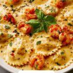 This Lobster Ravioli in Lemon Butter Sauce is a luxurious yet easy-to-make seafood pasta dish that pairs delicate lobster-filled ravioli with a rich, creamy lemon butter sauce. The sauce is flavored with garlic, fresh lemon juice and zest, and Parmesan cheese, creating a bright and decadent complement to the ravioli. Garnished with fresh parsley and optional red pepper flakes, this elegant dish is perfect for a special dinner or entertaining guests.