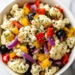This Marinated Cauliflower Salad is a vibrant and flavorful dish featuring crisp cauliflower florets tossed with olives, banana peppers, red bell pepper, and red onion, all coated in a zesty Italian-seasoned Parmesan dressing. Perfect as a refreshing side or a light lunch, this no-cook salad benefits from marinating for at least 30 minutes to develop its bold flavors.