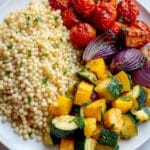 On a large sheet pan, combine the zucchini, yellow squash, red onion, diced bell pepper, grape tomatoes, and still skin-on garlic cloves. Drizzle them with 1 tablespoon of olive oil and sprinkle with 1 teaspoon kosher salt and ½ teaspoon black pepper. Toss everything together so each piece is nicely coated with oil and seasoning. Roast for about 25 minutes, stirring once halfway through, until the veggies are golden around the edges and tender to the bite. You’ll notice the garlic softens and caramelizes, making it sweet and mellow.