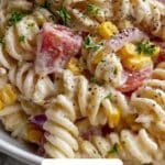 Since this is a cold pasta salad, it’s best served chilled. If you prefer it at room temperature, simply let it sit out for about 15 minutes before serving. Reheating is not necessary or advised to preserve the creamy texture and fresh flavors.