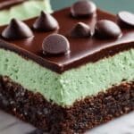 Lastly, melt one cup of semi-sweet chocolate chips together with two tablespoons of unsalted butter until smooth and glossy. Pour this over the mint filling, spreading gently with a spatula to cover the surface uniformly. Pop the entire pan into the refrigerator to chill for at least an hour. This allows all layers to firm up and makes slicing much easier.