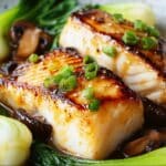 This elegant Miso Glazed Black Cod is perfectly roasted to achieve a caramelized glaze and served atop tender baby bok choy and shiitake mushrooms sautéed in garlic and sesame oil. This Asian fusion dish balances rich, savory flavors with fresh vegetables, creating a delightful main course that is both sophisticated and nourishing.