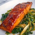 This Miso Salmon on Sautéed Spinach recipe features tender salmon fillets coated with a savory-sweet miso glaze, baked to perfection, and served over a bed of fragrant sautéed spinach with shallots, garlic, and ginger. It’s a quick, flavorful, and healthy dinner option ready in just 30 minutes, blending Asian-inspired flavors with wholesome ingredients.