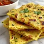 These protein-packed savory lentil pancakes come alive with fresh garnishing. A sprinkle of chopped fresh cilantro or a dollop of cooling yogurt makes for an excellent topping. To amp up the taste even more, serve with tangy green chutney or a splash of zesty tomato ketchup – the perfect complements that balance the savory, slightly spicy flavors of the chillas.