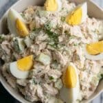 A quick and classic tuna salad recipe combining tuna, hard-boiled eggs, mayonnaise, and flavorful additions like Dijon mustard and pickles for a creamy, tangy dish perfect for sandwiches, toast, or salads.