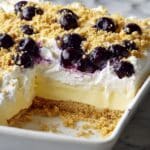 This No Bake Lemon Blueberry Dessert is a refreshing and easy-to-make treat perfect for warm days or any occasion. Featuring a crisp graham cracker crust layered with a creamy lemon filling, juicy blueberry pie topping, and luscious whipped cream, this dessert requires no baking and only minimal chilling time. It serves 20, making it ideal for gatherings and family celebrations.