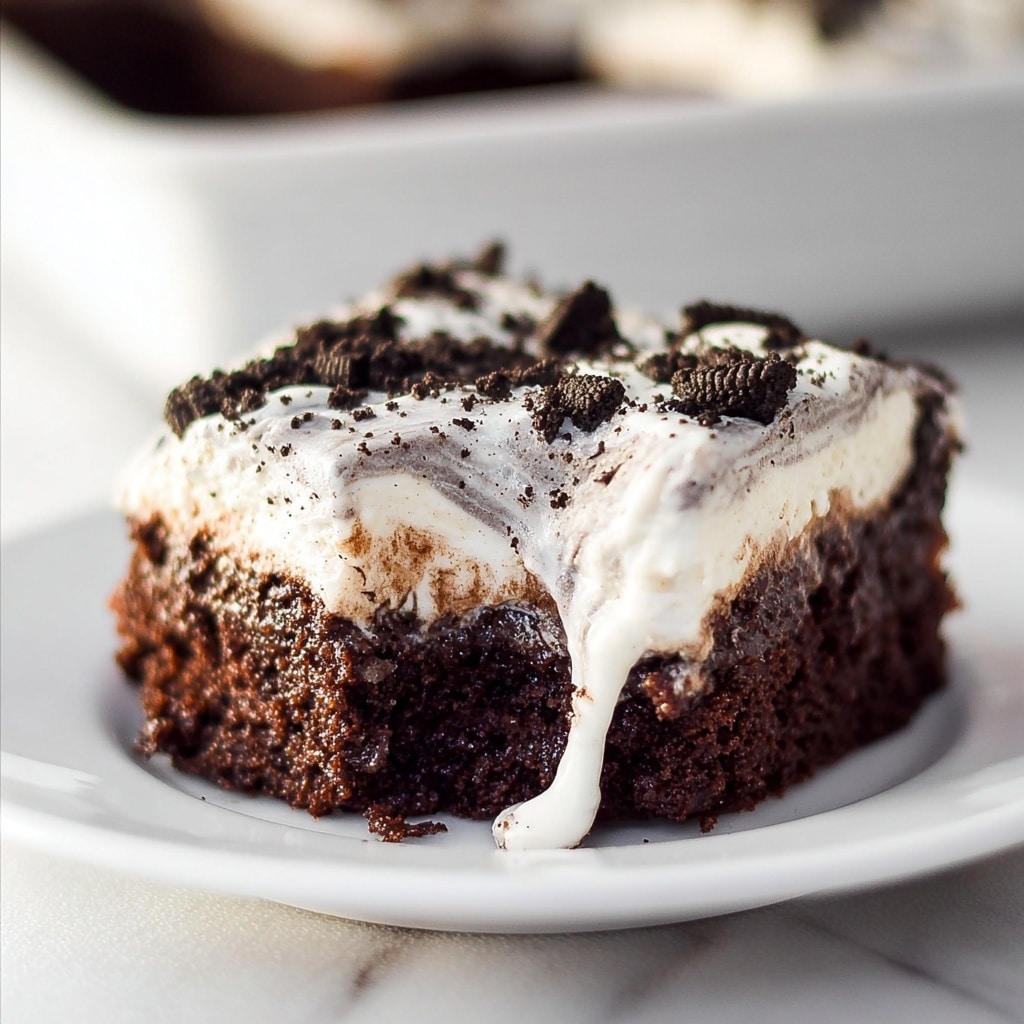For gatherings, try serving this dessert in individual clear cups or mason jars, layering the cake, pudding, and crushed Oreos separately for a fun poke cake parfait. Alternatively, cut the cake into small squares and serve it on decorative appetizer trays for easy sharing. Presentation truly makes this dessert shine in any setting.