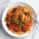 Pasta Puttanesca is a robust and flavorful Italian dish featuring a savory tomato sauce infused with anchovies, olives, capers, and red pepper flakes. This easy-to-make recipe comes together in about 40 minutes and combines the bold, briny flavors of the Mediterranean with tender al dente pasta for a satisfying meal perfect for weeknight dinners.