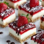 It’s best to enjoy these cheesecake bars chilled, but if you prefer a slightly softer texture, you can let them sit at room temperature for 15 to 20 minutes before serving. Avoid microwaving as it can cause the texture to become grainy or rubbery. The gentle warmth from room temperature really unlocks the flavors without compromising the creamy consistency.