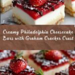 These Philadelphia Cheesecake Bars offer a smooth, creamy texture atop a crisp graham cracker crust. Perfectly baked to achieve a delicate balance between a set edge and a gently jiggly center, they’re ideal for serving plain or with a variety of toppings like fresh berries, chocolate sauce, caramel sauce, and whipped cream. A classic dessert that’s simple to prepare and sure to impress any cheesecake lover.