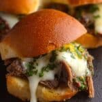These Philly Cheesesteak Sliders are a perfect party appetizer or game day snack, featuring tender shaved steak, caramelized onions and green peppers, melted provolone cheese, all nestled in soft sweet buns and baked to golden perfection with a flavorful butter and thyme glaze.