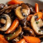A vibrant and tangy pickled mushroom and carrot side dish featuring rehydrated shiitake mushrooms and crisp julienned carrots marinated in a savory blend of rice vinegar, soy sauce, garlic, ginger, and aromatic sesame oil. Perfect for adding a flavorful punch to rice bowls, salads, or enjoyed on their own as a refreshing vegan and gluten-free appetizer.