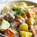 If you prefer to serve the salad warm, gently reheat just the potato portion before mixing back in the chilled dressing and salmon. Avoid reheating the entire salad as the fresh herbs and salmon taste best when kept cool or at room temperature.