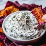 While the dip can be frozen in an airtight container for up to a month, beet chips unfortunately don’t freeze well; they tend to lose their crisp texture when thawed, so it’s best to enjoy the chips fresh.