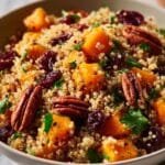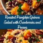 This Roasted Pumpkin, Pecan & Cranberry Quinoa Salad is a wholesome, nutrient-packed dish perfect for fall or any season. It features tender roasted pumpkin cubes, nutty quinoa, sweet dried cranberries, crunchy toasted pecans, and fresh leafy greens, all brought together with a tangy maple Dijon dressing. Ideal as a light lunch, side dish, or meal prep option, this vibrant salad balances textures and flavors beautifully while being vegetarian and gluten-free.