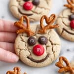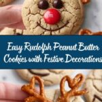 Rudolph Peanut Butter Cookies are a festive and fun treat perfect for the holiday season. These soft and chewy cookies combine creamy peanut butter with a classic cookie dough, then get a playful Rudolph makeover with mini pretzels for antlers, red M&M noses, and mini chocolate chip eyes.