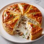 To warm leftovers, preheat your oven to 350°F (175°C) and heat the pie on a baking sheet for 15-20 minutes until hot and the crust is crisp again. Avoid microwaving to maintain the puff pastry’s flakiness.