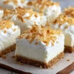 These Skinny Coconut Cheesecake Bars offer a deliciously creamy, lower-fat twist on traditional cheesecake, featuring a crunchy graham cracker and coconut crust paired with a smooth coconut-infused filling. Perfect for a light dessert that’s both satisfying and rich in flavor.