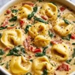 Reheat leftovers gently in a saucepan over medium-low heat, stirring frequently to prevent scorching. Add a splash of broth or cream if the soup seems too thick. For best results, add fresh tortellini and spinach when reheating rather than storing them cooked.