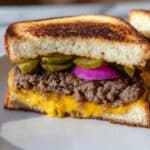 Once done, remove the sandwiches from the skillet and let them rest for about a minute. This brief pause helps the cheese set slightly so it doesn’t spill everywhere when you slice. Then slice, serve warm, and get ready to savor every fantastic bite of your homemade Smashed Burger Grilled Cheese Recipe.