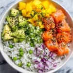 While the coconut rice and salmon can be frozen separately, keep in mind that fresh toppings like avocado and mango do not freeze well. Freeze the cooked salmon and rice in airtight containers for up to 1 month. Thaw overnight in the refrigerator before reheating gently.