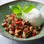 Spicy Thai Basil Chicken, also known as Pad Krapow Gai, is a vibrant and flavorful stir-fry featuring tender chicken thighs, fresh basil, and a savory-spicy sauce. This quick and easy Thai classic is perfect for a satisfying weeknight dinner, served hot over steaming rice.