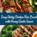 These Sticky Chicken Rice Bowls feature tender bite-sized chicken pieces coated in a sweet and savory homemade sauce served over fluffy jasmine or brown rice. With a perfect balance of soy sauce, honey, garlic, ginger, and sesame oil, this quick and flavorful dish is ideal for a satisfying weeknight dinner. Customize it with fresh vegetables like cucumbers, carrots, green onions, cilantro, and creamy avocado slices for a vibrant and wholesome meal.