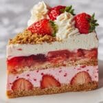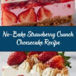 This Strawberry Crunch Cheesecake Delight is a luscious no-bake layered dessert featuring a buttery Golden Oreo crust, creamy vanilla cheesecake layer, macerated fresh strawberries, and a crunchy strawberry-flavored topping. Perfectly chilled and bursting with fruity and creamy flavors, this American-style dessert makes a delightful treat for summer gatherings or any special occasion.