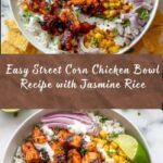 This Street Corn Chicken Bowl recipe combines juicy, marinated chicken thighs with a creamy, tangy street corn mixture and fluffy jasmine rice. Inspired by Mexican street corn flavors, it makes a satisfying and flavorful meal perfect for lunch or dinner, featuring fresh herbs, zesty lime, and a delightful combination of textures and spices.