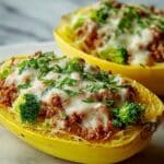 This Stuffed Spaghetti Squash recipe combines the hearty flavors of ground beef and tender broccoli with the unique texture of roasted spaghetti squash. Baked to perfection and topped with melted mozzarella cheese, it makes a wholesome and comforting meal that’s perfect for a family dinner or meal prep.