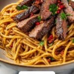 A flavorful Sweet and Spicy Garlic Steak Pasta combining tender flank steak with a bold, savory sauce made from garlic, soy sauce, honey, and sriracha, tossed with fettuccine for a satisfying Asian-American main course that’s quick to prepare and packed with robust flavor.