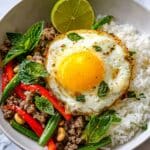 5. Add Basil and Serve: Remove the pan from heat and gently stir in the torn Thai basil leaves until just wilted. Serve immediately, ideally with steamed rice, and optionally topped with a crispy fried egg and a squeeze of fresh lime juice for extra brightness.