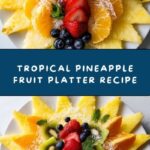 A vibrant and refreshing Tropical Pineapple Fruit Platter featuring a colorful assortment of fresh pineapple, mango, kiwi, papaya, strawberries, and blueberries, topped with zesty lime juice, shredded coconut, and fresh mint for a stunning presentation and delightful tropical flavor.